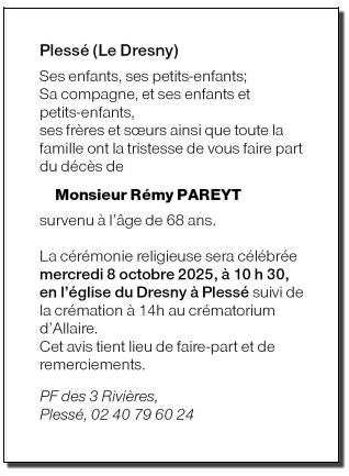 Décédé à Plessé (44630, France) le mercredi 1 octobre 2025 à l'âge de 68 ans