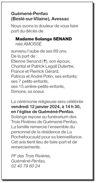 Décédée à Plessé (44630, France) le mercredi 10 janvier 2024 à l'âge de 88 ans